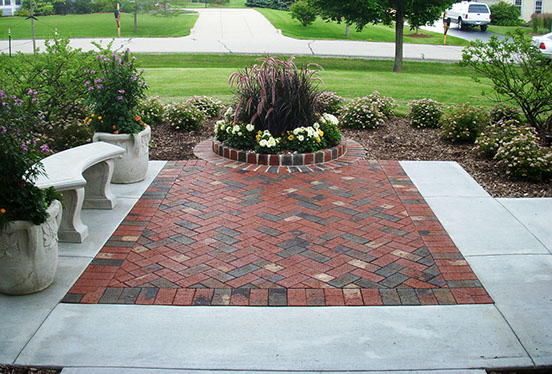 To create a more exciting patio at this front entry, we inset a brick “blanket” inside the concrete. A brick trimmed planter establishes an elegant focal point.