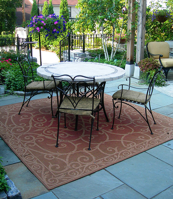In this Whitefish Bay back yard, we created several living areas including this eating area furnished with a table, comfy chairs and an outdoor rug.