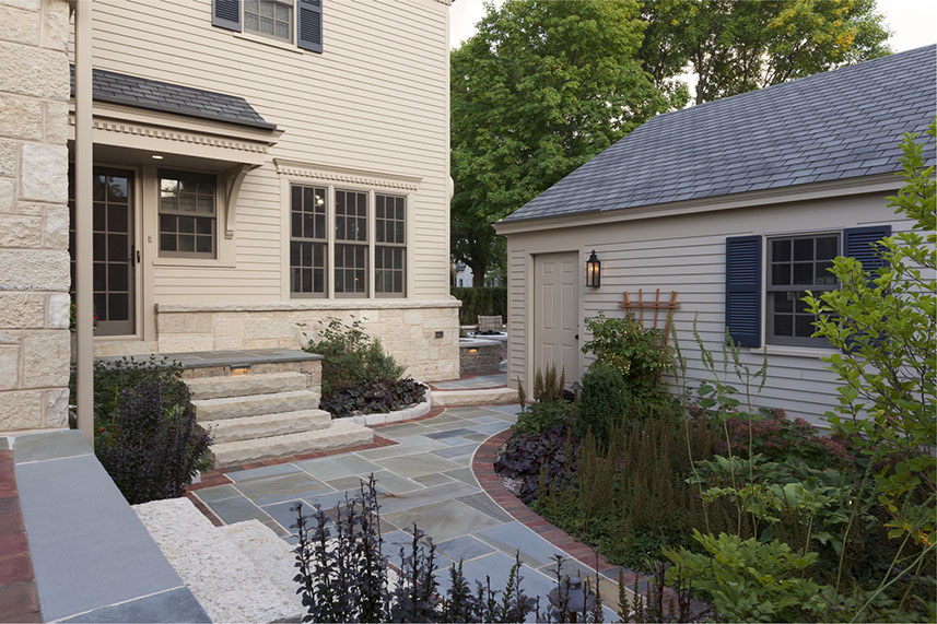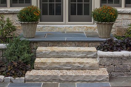 Unilock Estate wall stone holds back gravel base for the paving for the terrace and stoops, complementing the stone on the house.