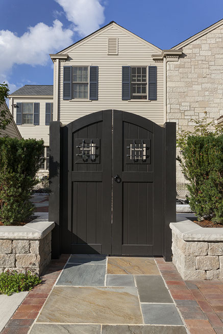 A specially designed heavy gate made of clear Western Red Cedar, welcomes visitors to the main outdoor living area. The posts built into the planters, door-style hinges and elegant black were selected to create a more door-like look. The metal grid windows and curved top match the windows on the house and the garage doors.