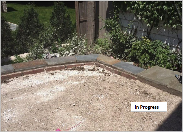 Bluestone coping is mortared on the terrace walls. 1 ½ inch traffic bond is compacted as the base material for dry laid brick. Brick joints are filled with a polymeric sand which hardens into a flexible grout.