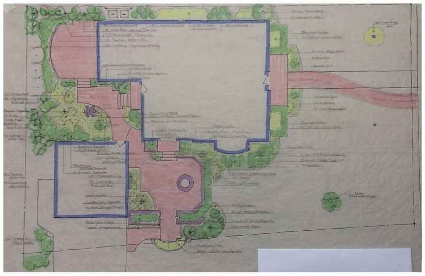 (1) Initially the owners thought that there would only be room for patios and sitting areas on the back side of the house. However, by meeting with the builder before the home renovation, they were able to redesign certain walls in the house and locate the detached garage addition in an area that allowed for more outdoor rooms, by utilizing the side area of the house. These three areas provided different functions; A) a sitting area with a gas fire ring, B) a garden area outside of the sunroom, and C) a dining terrace that includes the outdoor grill.