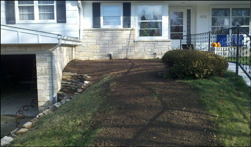 Photo 12: Topsoil installed, sloping away from foundation. Rebuilt Lannon stone wall.  Lawn area was restored.