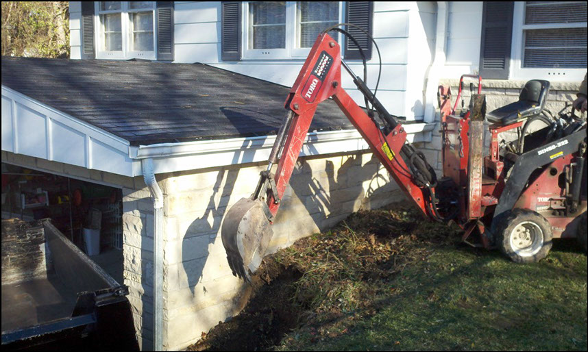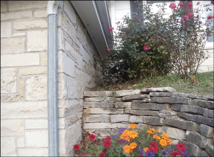 Photo 2:  Soil outside causes pressure on the garage wall.  Water frequently overtopped the undersized gutters and downspouts, adding to the problem.