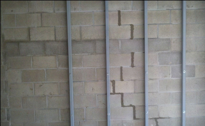 Problem:  Garage wall was cracked and bowed, with efflorescence forming on the bottom. The bottom course of block has slipped inward 1.5 inches.
