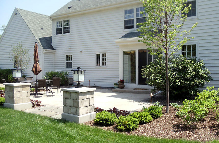 Concrete block columns topped with lanterns frame the entry to this patio.