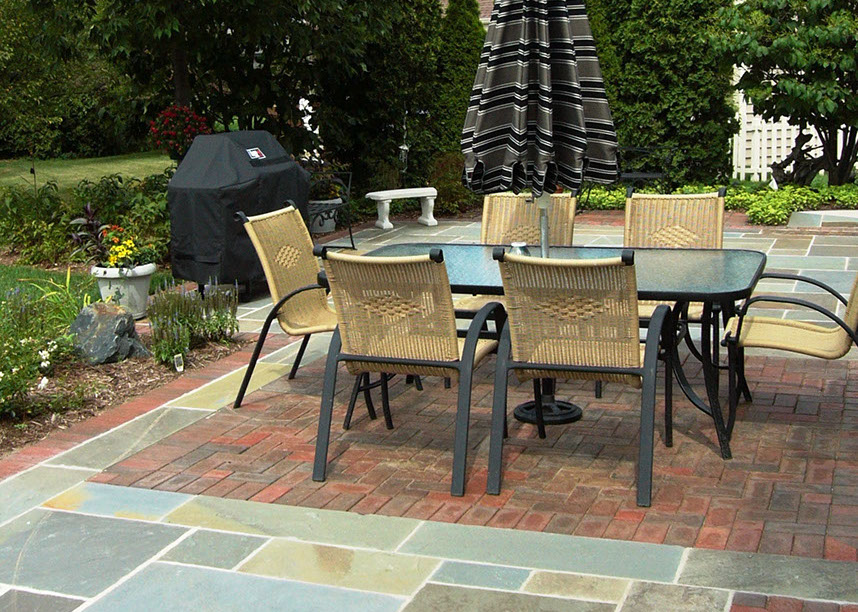 A Bluestone and brick combination breaks up a large patio into different areas for different functions. Here the brick inset acts as the dining area.