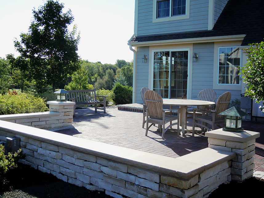 This Lannon stone wall acts as a seat wall, defines a sense of space and privacy. Columns with lanterns anchor the wall.