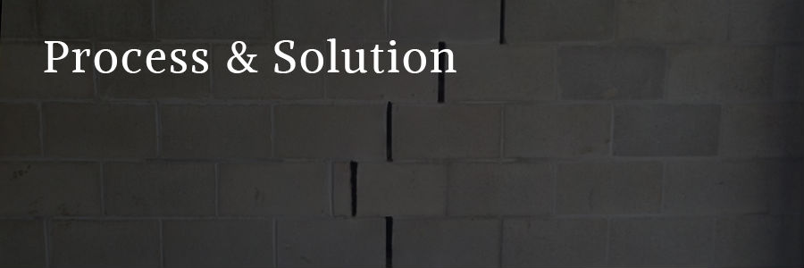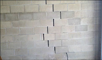 Problem: Garage wall was cracked and bowed with efflorescence forming on the bottom. The bottom course of block slipped inward 1.5 inches.
